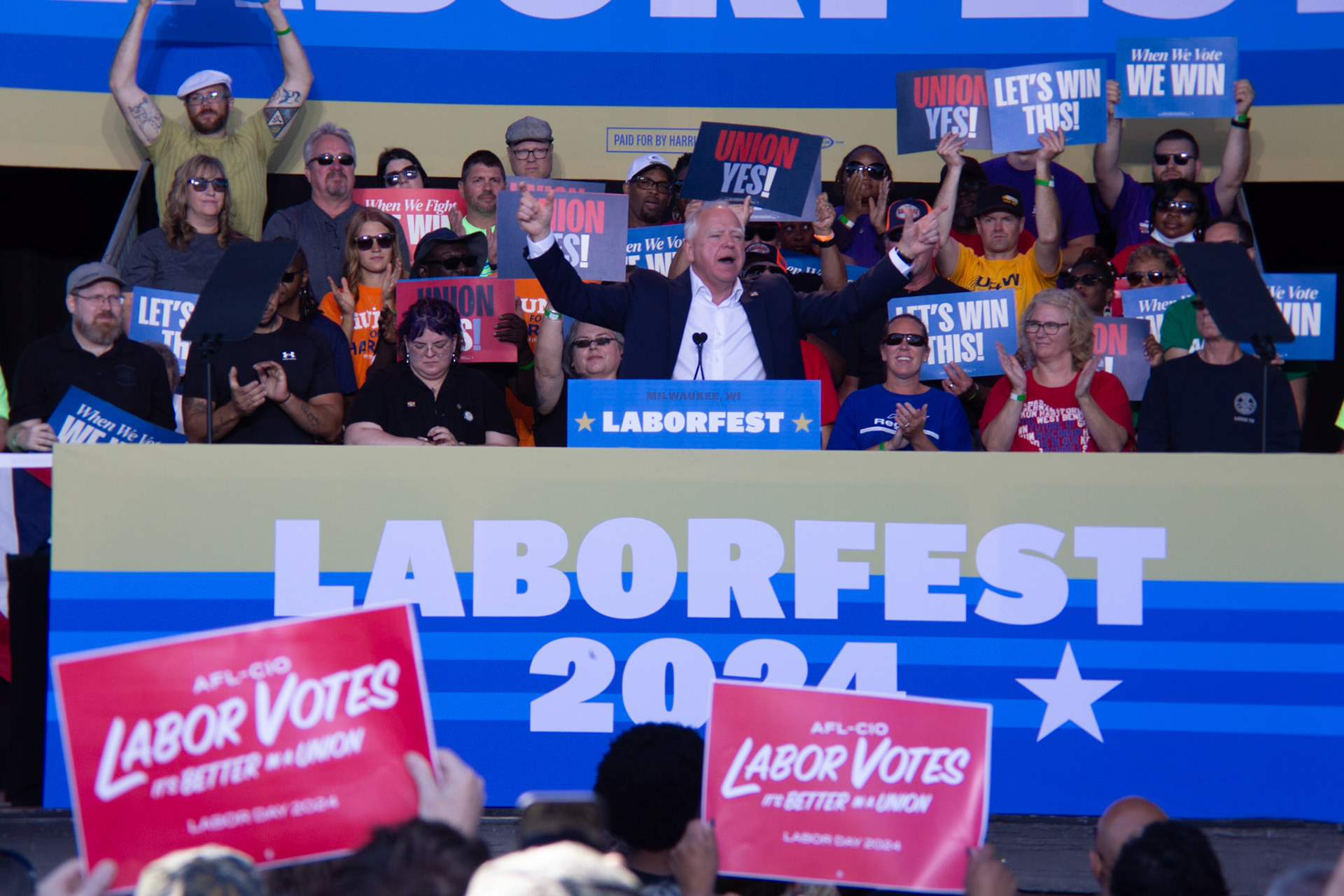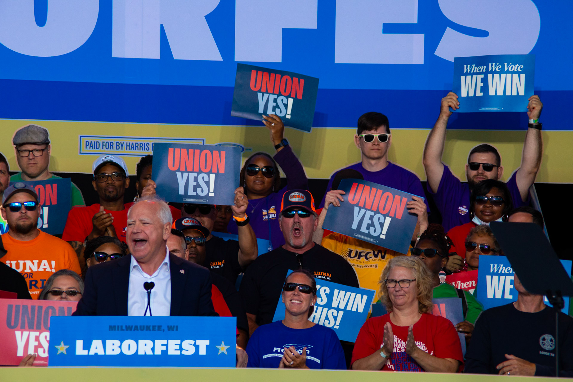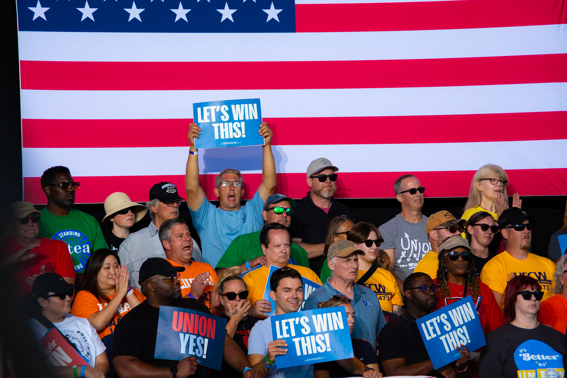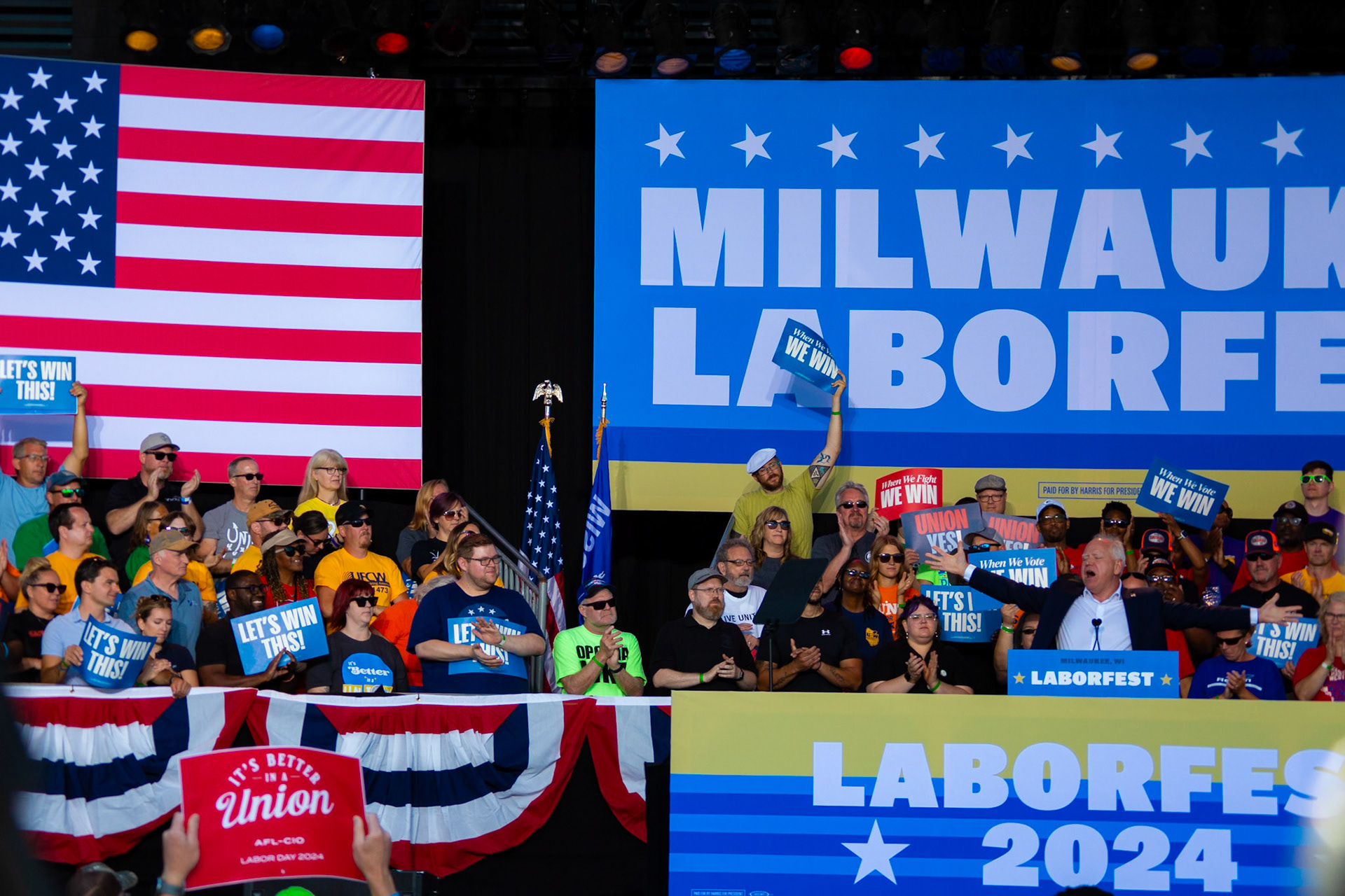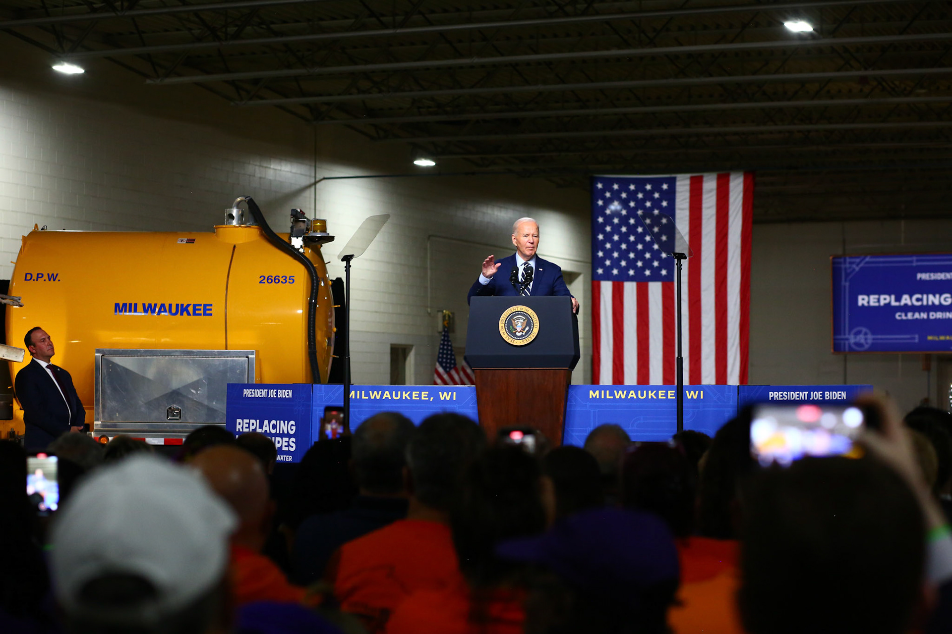 President Joe Biden delivers remarks on stage with two Milwaukee locals at the Department of Public Works Field Headquarters in Milwaukee, WI on October 8th, 2024. (Photo by Aidan DeStefano/Sipa USA)